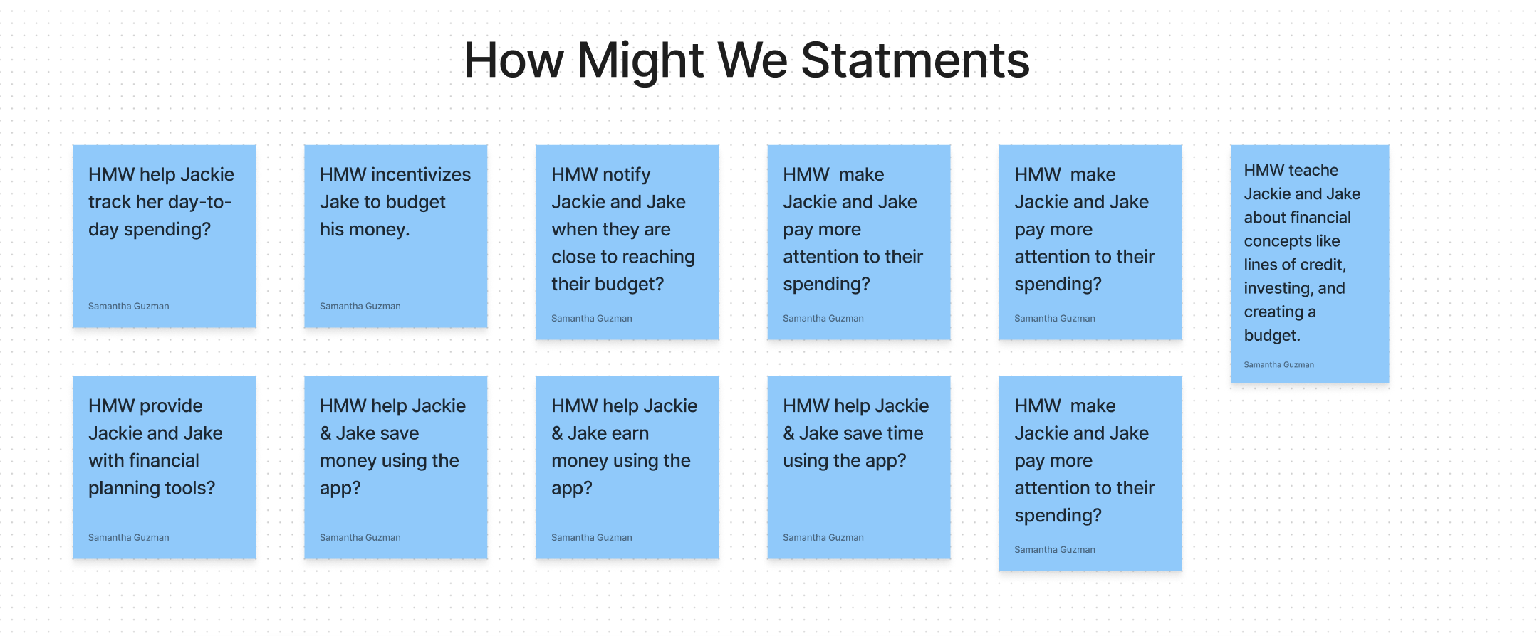 "How Might We" (HMW) statements are questions that allow designers to reframe our insights into opportunity areas and innovate on problems found during user research. They are a rewording of the core need uncovered through user research. I have found that it helps teams focus on user needs and problems, rather than just jumping straight to solutions. To begin the ideation process I lead a how might we statement exercise, to begin thinking.