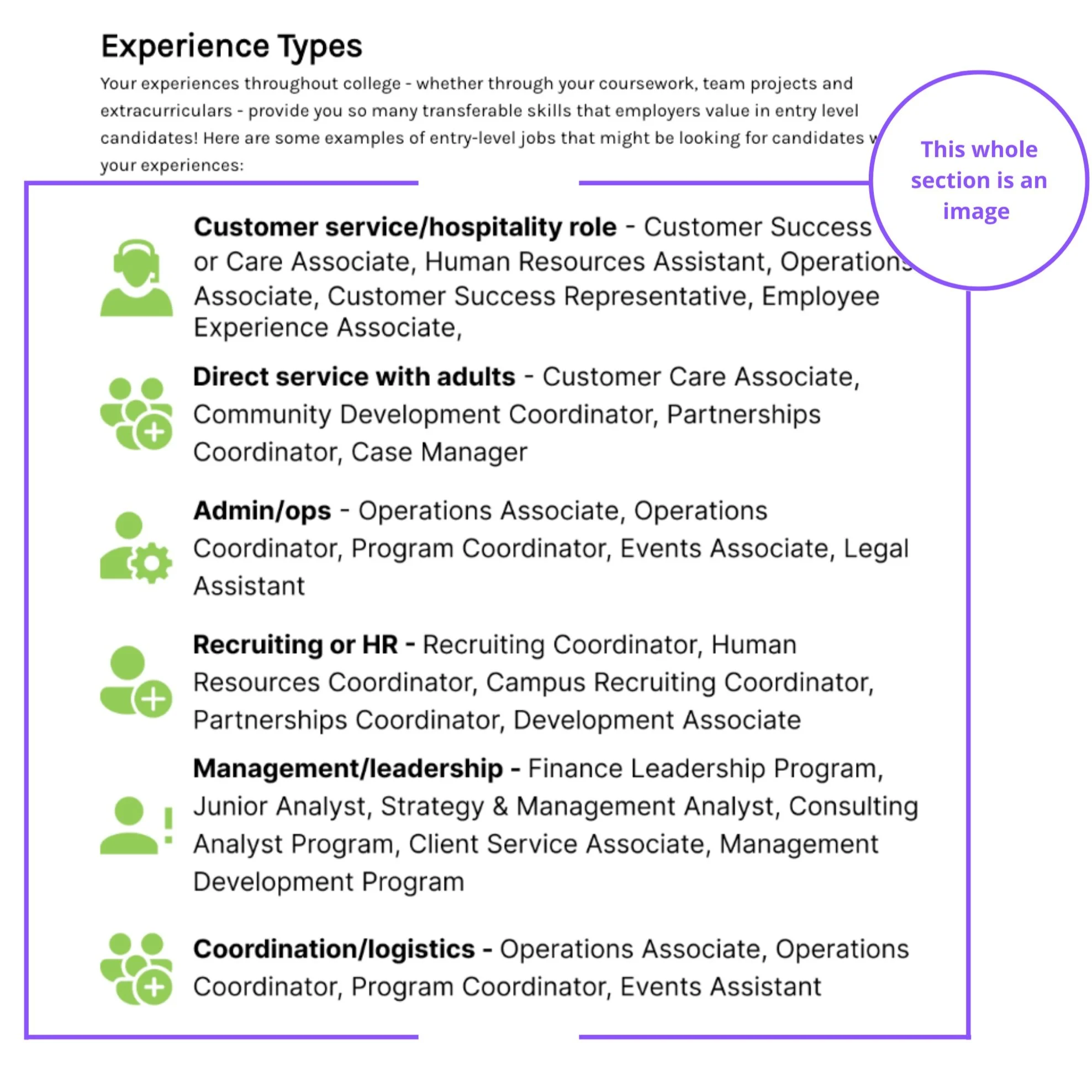 These images limit the page's Accessibility. What if a user wanted to translate the page because English is their second or third language? What if the user is part of the 250 Million people that need screen readers to access the internet? The gaps in the data would block users with disabilities from getting the insights they need during this career search.