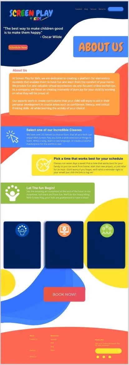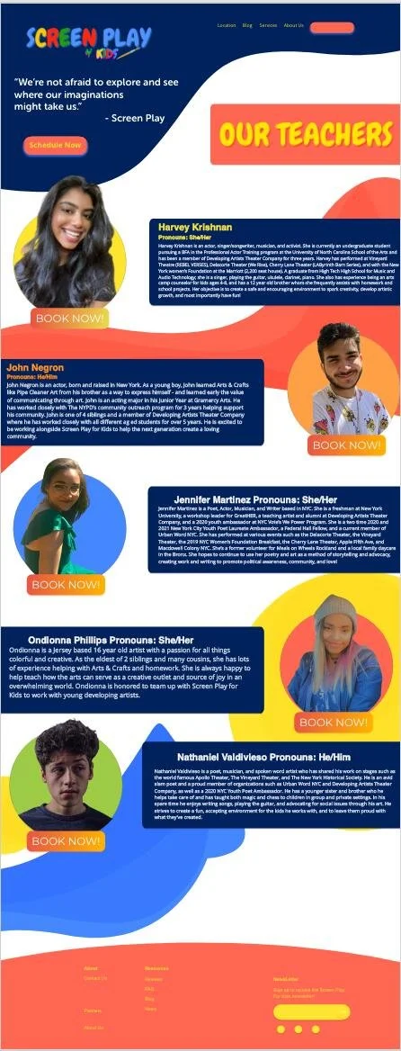 Screen Play for Kids is a platform for elementary students to have fun and learn from the comfort of their homes. They provide fun and valuable virtual experiences via arts-focused online workshops. My task was to create a simple child-themed website experience for parents to schedule group and one-on-one workshops.