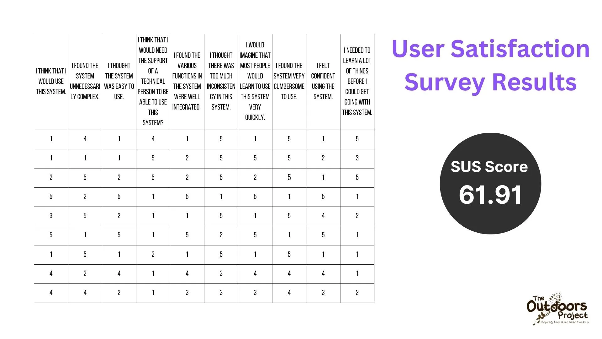 After initial inquiries, we had users from the contextual fill out a user satisfaction survey. Most users were unsatisfied with the process and needed clarification on the existing booking process. On average, the user's responses lead to a genre sus score of 61.91.