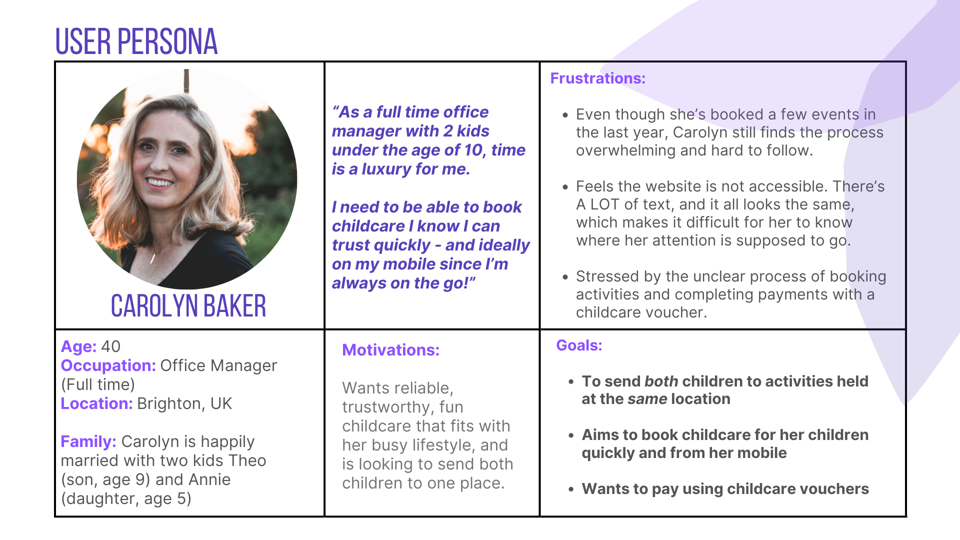 We created Carolyn to help us focus on who, specifically, we were designing for. Like most parents of young children, Carolyn feels like there are never enough hours in the day. After recently going back to working in an office full-time instead of from home, that sentiment is even stronger, and Carolyn is looking to sign her children, Theo and Annie, up for more professional childcare. Carolyn has booked six Outdoor Project events for Theo over the past year, but there have been a couple of time-consuming obstacles preventing her from using them more. Mostly, there's the clunky booking process. Especially paying for activities, as Carolyn uses childcare vouchers, which involve a LOT of back and forth between the Outdoors Project website, her email, and communicating with her voucher provider. While she struggles to trust the website, Carolyn wholeheartedly trusts the staff. Now that Annie is old enough to attend their activities, Carolyn’s motivation to book events with The Outdoors Project has increased.